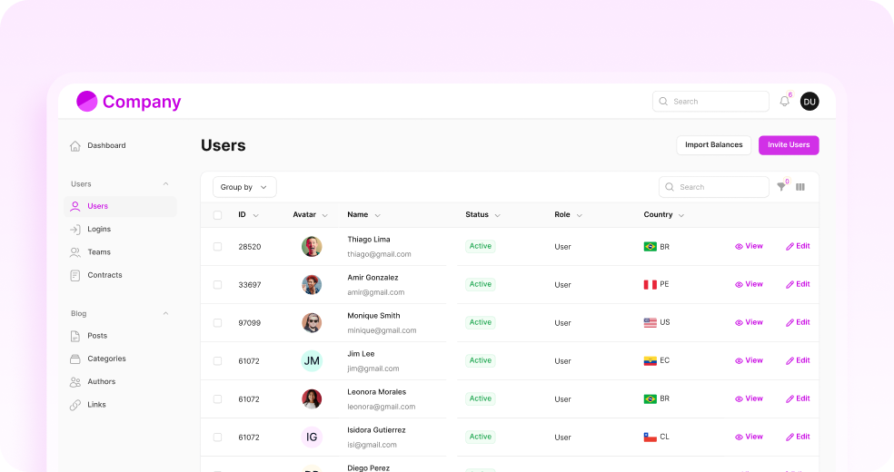 Build the full workflow for your clients or users. Send access invites, assign roles, create teams, and easily set up payments and commissions.