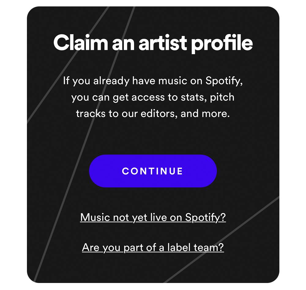 Antes de continuar con la solicitud de acceso, Spotify te preguntará si ya tienes música disponible en la plataforma. Haz click en «Continue» para avanzar.